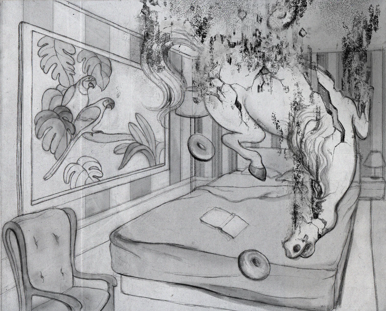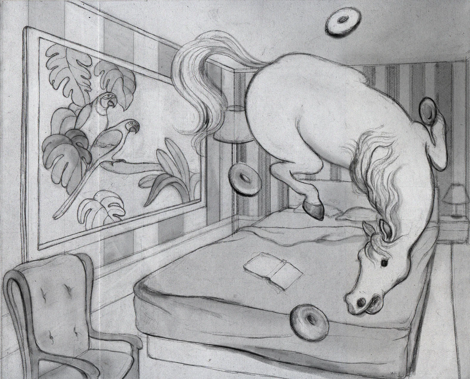 Disintegrating horse in an old hotel room, cashing after some donuts.